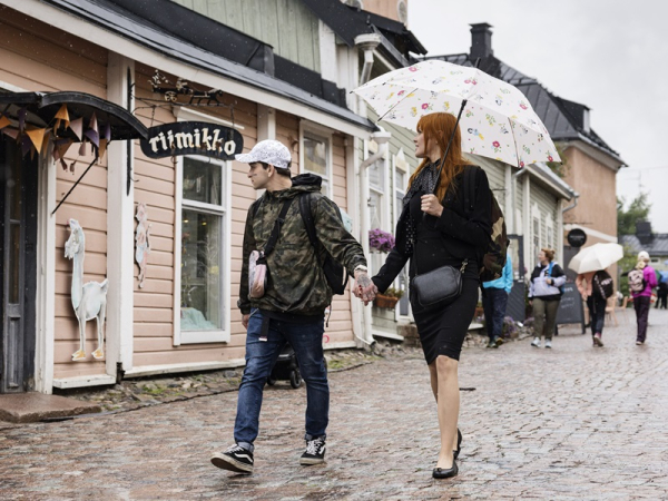 People walked in the cool and rainy old town of Porvoo on 3 July 2024. A Visit Finland expert told YLE in June that Finland could see a roughly 10-per-cent increase in inbound summer tourism in 2024. (Roni Rekomaa – Lehtikuva)